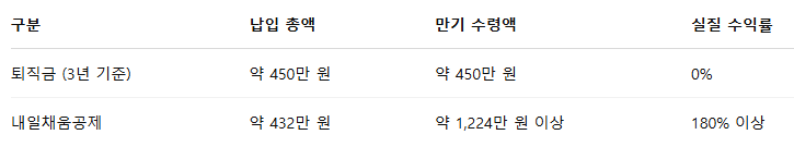 이는 같은 기간 동안 받을 수 있는 퇴직금보다 2배 이상 많은 금액으로, 장기 근속을 전제로 한 자산 형성 수단으로 매우 유리한 구조입니다.